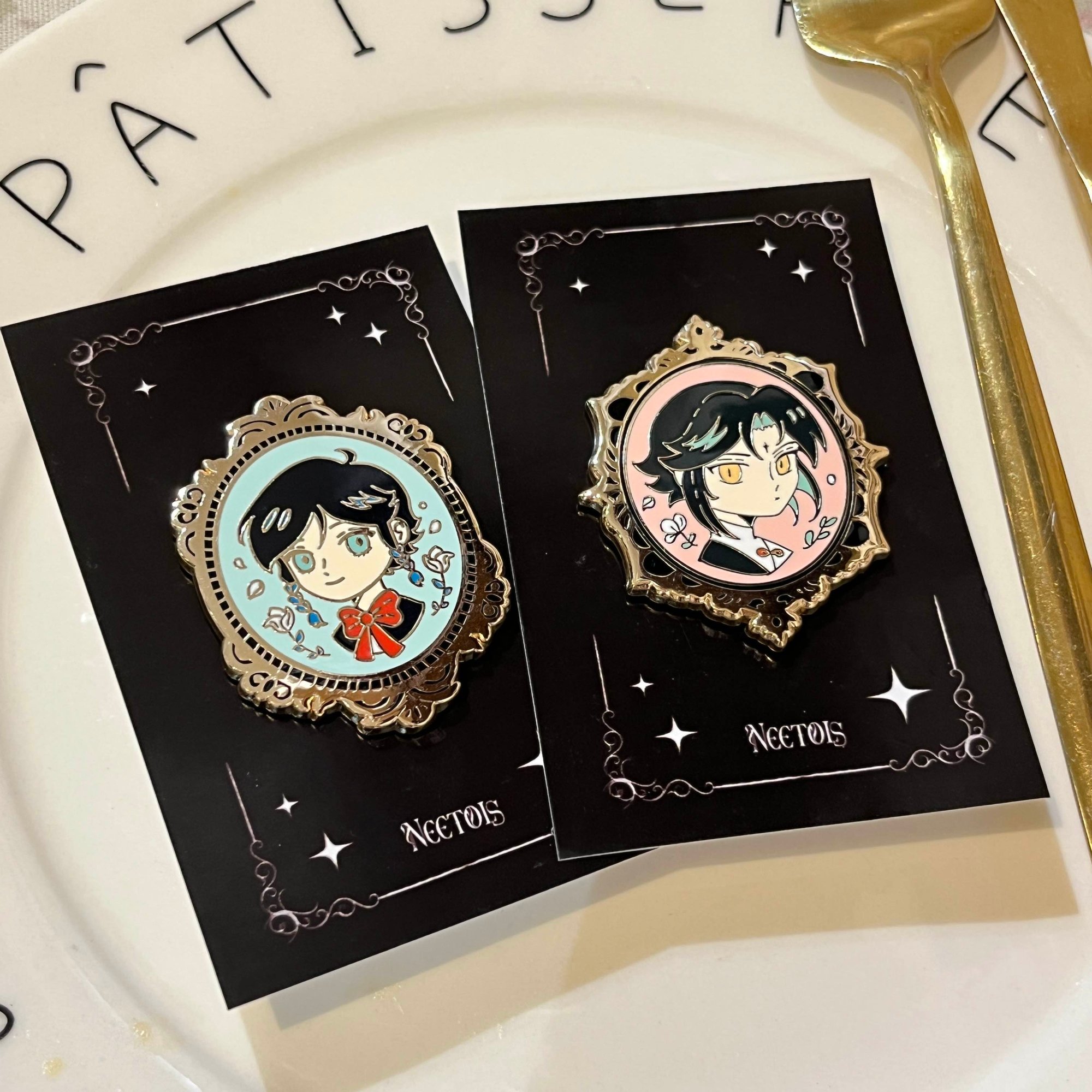 4.5cm hard enamel pin with gold plating and 2 black rubber clutch. This is a new product, sample is currently in production.
